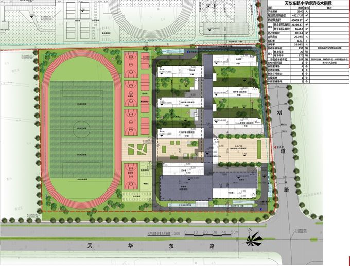江北新区天华东路小学建设工程总建筑面积约4.03万平方米,其中地上建筑面积约3.17万平方米,地下约0.86万平方米。包含教学区约1.95万平方米(8轨48班),办公区约0.44万平方米,生活区约0.58万平方米及其他相关配套设施等。